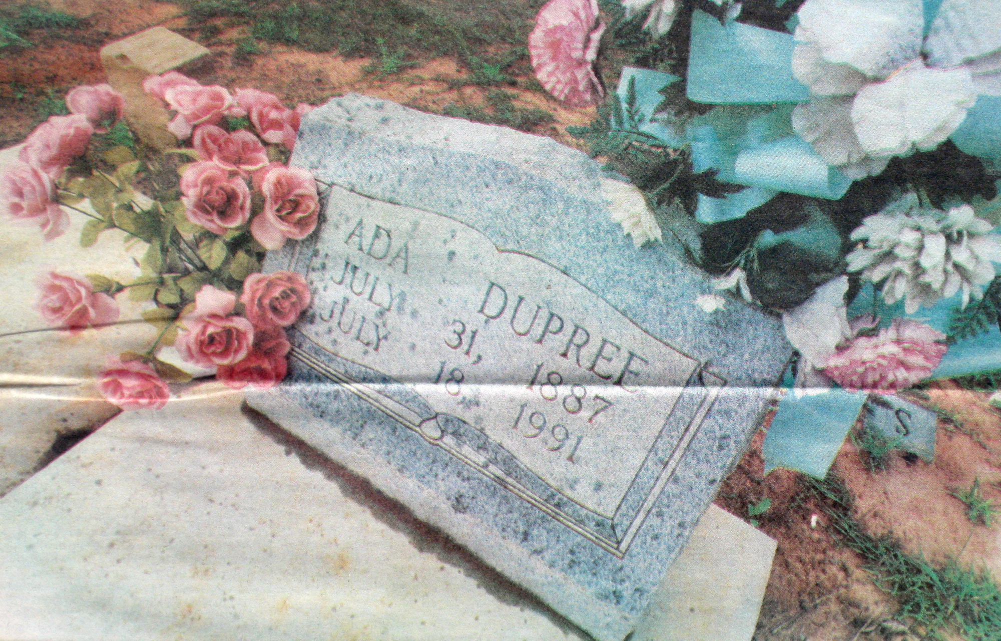 On July 24, 191, one week before her 104th birthday, Ada Dupree was buried next to her son Ralph and his wife, Mittie, in the Graceville cemetery, 10 miles from her hometown. A big sycamore tree drops seed pods and leaves on Ada’s gravae. Birds feed on the ground. Shrubs send out wild shots. The gravestones come in all shapes andn sizes, some leaning over and cracked, others knocked down. The gras is spotty with red clay patches. Kids play in the street around it, somethings running into the cemetery to get a stray ball. The Graceville cemetery is not at all like the Esto cemetery. It is more flawed, more alive. But it is not what Ada Dupree wanted.