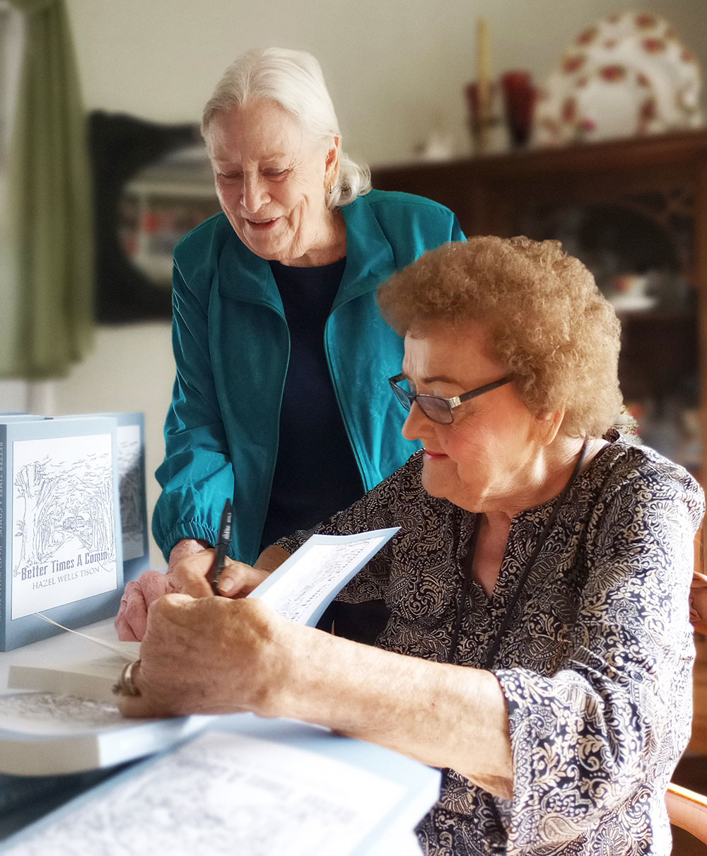 Hazel Tison (right) signs a copy of her new book as publisher Sue Cronkite looks on. Photos by Mary Ivey.