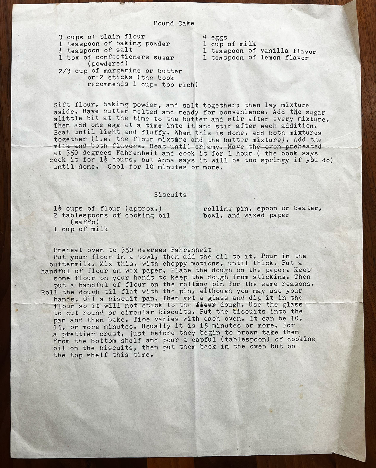 Anna delighted us with her favorite dishes. Two recipes in particular captivated us so much that we asked her to write them down and teach us to make them: her lemon pound cake and her buttermilk biscuits. These recipes have endured for more than 65 years and we continue to savor both dishes. Just last night, my brother Steve and I and our families relished Anna’s pound cake after our weekly Sunday dinner in San Diego, prompting this story.
